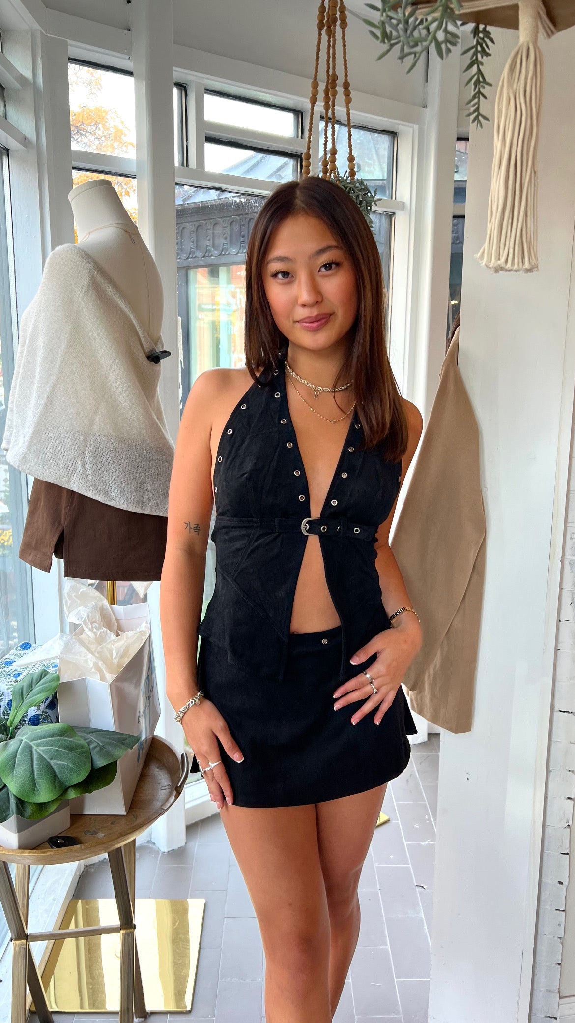 - This faux suede halter top features a deep plunging neckline with grommet details, a front buckle closure, and an open tie-back design.