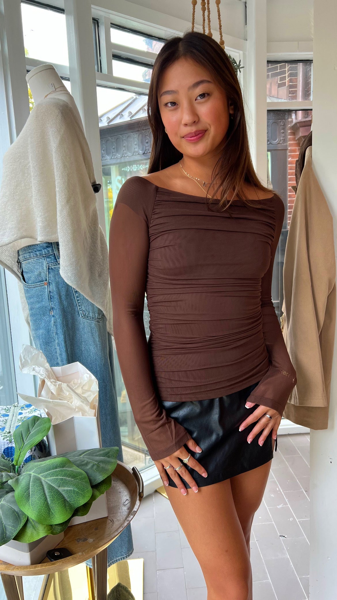 - This ruched mesh off-shoulder top features sheer long sleeves with a fitted silhouette and a lined bodice.